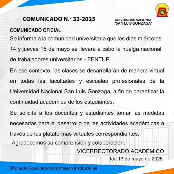 En ese contexto, las clases se desarrollarán de manera virtual en todas las facultades y escuelas profesionales de la Universidad Nacional San Luis Gonzaga, a fin de garantizar la continuidad académica de los estudiantes.