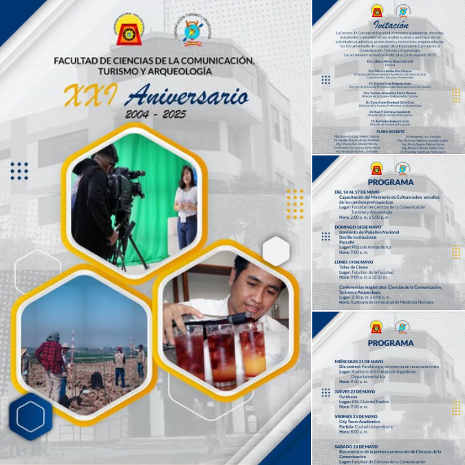 #FCCTA | La Decana, El Consejo de Facultad, directores académicos, docentes, estudiantes y administrativos, invitan a usted a participar de las actividades académicas, protocolares y recreativas, programadas por los XXI aniversario de creación de la Facultad de Ciencias de la Comunicación, Turismo y Arqueología.