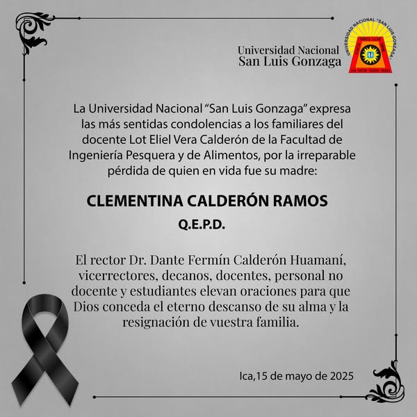 La Universidad Nacional “San Luis Gonzaga” expresa las más sentidas condolencias a los familiares del docente Lot Eliel Vera Calderón de la Facultad de Ingeniería Pesquera y de Alimentos, por la irreparable pérdida de quien en vida fue su madre: CLEMENTINA CALDERÓN RAMOS, Q.E.P.D.