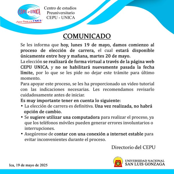 La elección se realizará de forma virtual a través de la página web CEPU UNICA, y no se habilitará nuevamente pasada la fecha límite, por lo que se les pide no dejar este trámite para último momento.