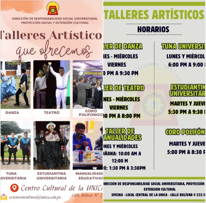 La Dirección de RSU, Proyección social y Extensión cultural invita a todos los estudiantes universitarios a participar de los Talleres Artísticos 2025, una oportunidad para explorar y desarrollar tus habilidades a través de los talleres de: danza, manualidades, teatro, coro polifónico, tuna y estudiantina.
