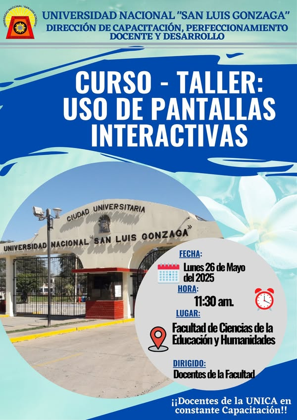 #Capacitación | La Dirección de Capacitación, Perfeccionamiento Docente y Desarrollo de la Universidad Nacional «San Luis Gonzaga» en coordinación con la Facultad de CIENCIAS DE LA EDUCACIÓN Y HUMANIDADES, invitan a los Docentes de la Facultad a participar en el taller USO DE PANTALLAS INTERACTIVAS a llevarse a cabo el día LUNES 26 de Mayo a horas 11.30 .m. en la instalaciones de la Facultad.