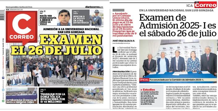 #Admisión2025-I El diario Correo en su edición impresa del 24 de mayo, informó sobre el inicio del proceso de admisión 2025-I en la Universidad Nacional San Luis Gonzaga, una de las instituciones más representativas de la región. Según la nota publicada, las inscripciones comenzarán este lunes 26 de mayo, marcando el inicio de una etapa clave para los postulantes que buscan una vacante en esta casa superior de estudios.