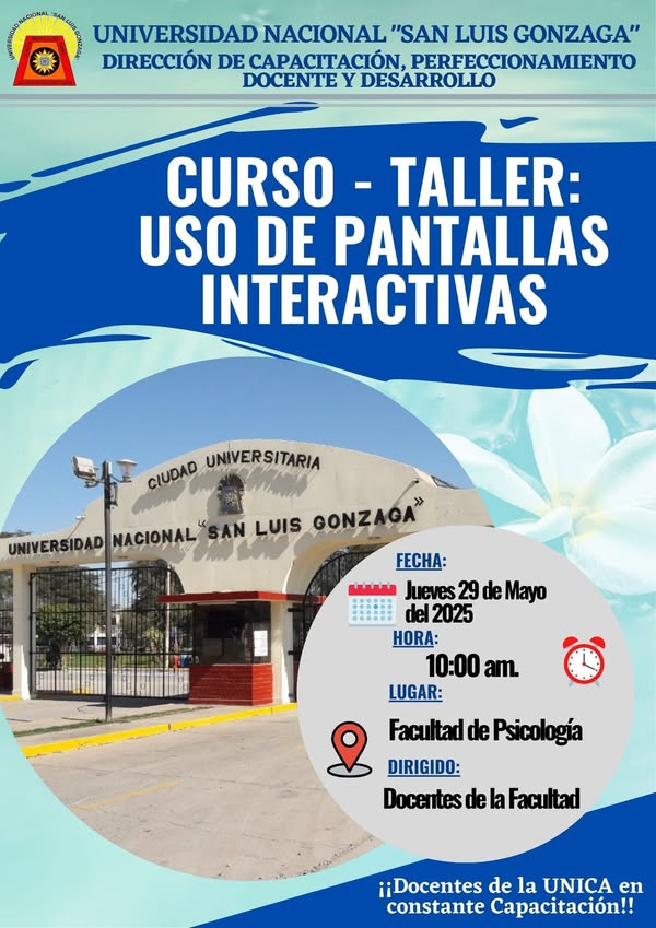 #Capacitación | La Dirección de Capacitación, Perfeccionamiento Docente y Desarrollo de la Universidad Nacional «San Luis Gonzaga» en coordinación con la Facultad de PSICOLOGÍA, invitan a los Docentes de la Facultad a participar en el taller USO DE PANTALLAS INTERACTIVAS a llevarse a cabo el día JUEVES 29 de Mayo a horas 10.00 a.m. en la instalaciones de la Facultad.