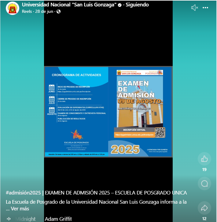 La Escuela de Posgrado de la Universidad Nacional San Luis Gonzaga informa a la comunidad universitaria y al público interesado que ya se encuentra habilitado el proceso de inscripción virtual para el Examen de Admisión 2025, el cual se realizará el día sábado 09 de agosto.