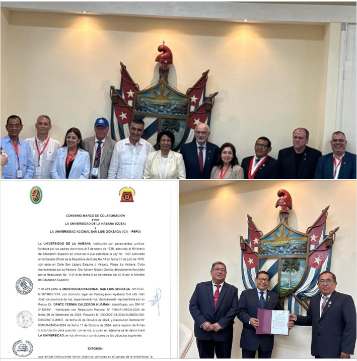 En esta oportuna el Dr. Dante Huamaní Calderón, ha suscrito un CONVENIO MARCO DE COLABORACIÓN, entre LA UNIVERSIDAD DE LA HABANA (CUBA) y LA UNIVERSIDAD NACIONAL “SAN LUIS GONZAGA” DE ICA (PERÚ), siendo los objetivos promover el desarrollo de la enseñanza superior y la investigación científica y tecnológica, comprendiendo los siguientes aspectos: a) Intercambio de Docentes, profesores, investigadores, estudiantes y personal administrativo; b) Formación y perfeccionamiento de docentes e investigadores; c) Intercambio de información; d) Estudios e investigación; e) Programas, cursos, seminarios, conferencias talleres y otros; d) Publicaciones y toda otra actividad idónea para lograr los objetivos del presente convenio; y g) asesorías mutuas.