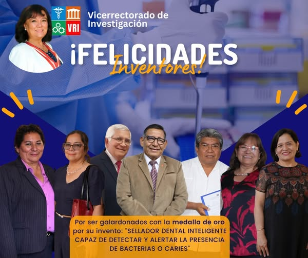 El Vicerrectorado de Investigación felicita con gran entusiasmo a los inventores del “Sellador Dental Inteligente capaz de detectar y alertar la presencia de bacterias o caries”, quienes han sido galardonados con la Medalla de Oro por este destacado aporte científico y tecnológico.