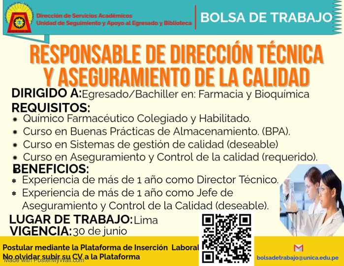 #OfertaLaboral | OFERTA LABORAL RESPONSABLE DE DIRECCIÓN TÉCNICA Y ASEGURAMIENTO DE LA CALIDAD