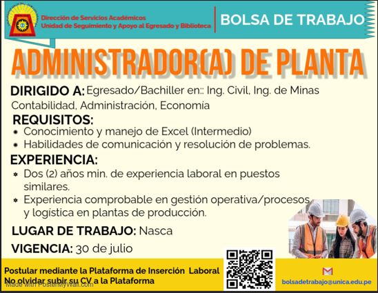 #OfertaLaboral | OFERTA LABORAL ADMINISTRADOR(A) DE PLANTA