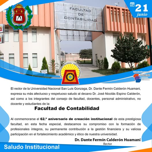 El rector de la Universidad Nacional San Luis Gonzaga, Dr. Dante Fermín Calderón Huamani, expresa su más afectuoso y respetuoso saludo al decano Dr. José Nicolás Espino Calderón, así como a los miembros del consejo de facultad, docentes, personal administrativo, no docente y estudiantes de la: