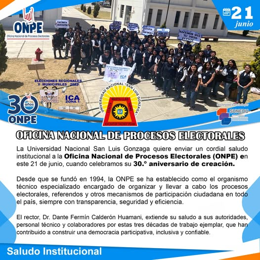 La Universidad Nacional San Luis Gonzaga quiere enviar un cordial saludo institucional a la ONPE Oficina Nacional de Procesos Electorales – Perú en este 21 de junio, cuando celebramos su 30.º aniversario de creación.