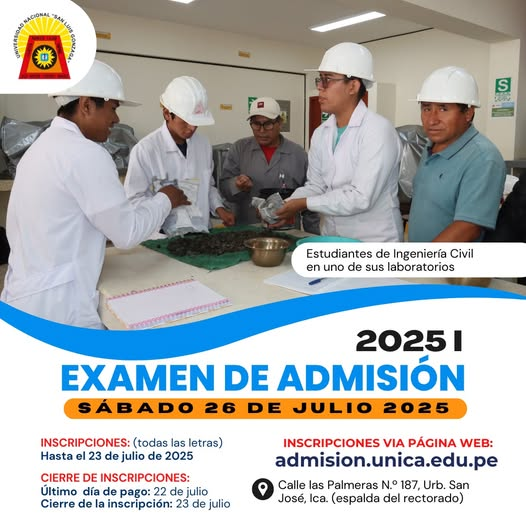 #Admisión2025I | 📣La Universidad Nacional “San Luis Gonzaga” convoca a examen de admisión para el sábado 26 de julio de 2025. 🙌😃