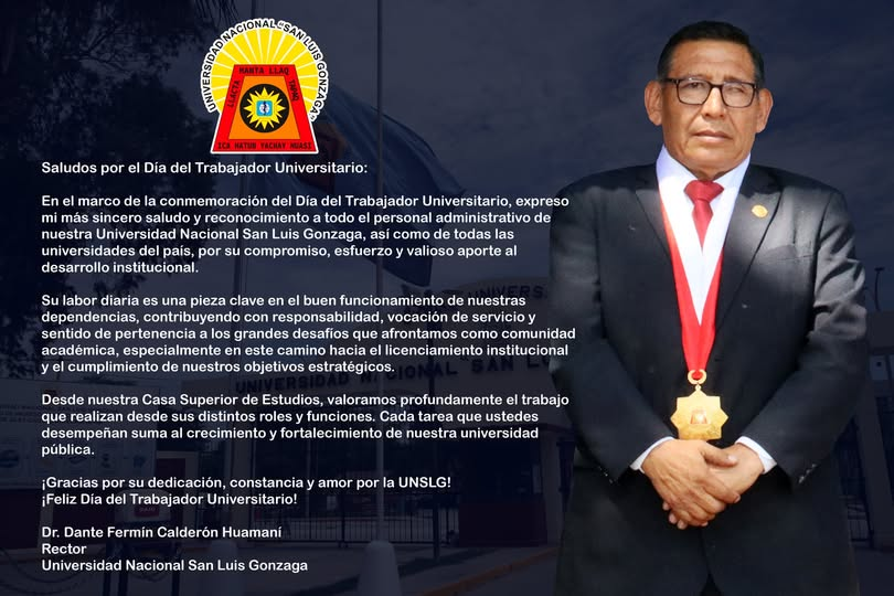 En el marco de la conmemoración del Día del Trabajador Universitario, expreso mi más sincero saludo y reconocimiento a todo el personal administrativo de nuestra Universidad Nacional San Luis Gonzaga, así como de todas las universidades del país, por su compromiso, esfuerzo y valioso aporte al desarrollo institucional.