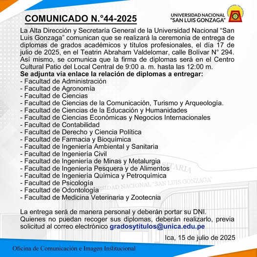 #EntregaDiplomas | La Alta Dirección y Secretaría General de la Universidad Nacional “San Luis Gonzaga” comunican que se realizará la ceremonia de entrega de diplomas de grados académicos y títulos profesionales, el día 17 de julio de 2025, en el Teatrín Abraham Valdelomar, calle Bolívar N°294. Así mismo, se comunica que la firma de diplomas será en el Centro Cultural Patio del Local Central de 9:00 a. m. hasta las 12:00 m.Se adjunta vía enlace la relación de diplomas a entregar: https://drive.google.com/…/1rOX4AnhGmMbp3FZMOnc…/view…