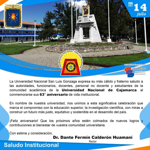 #SaludosInstitucionales2025 | La Universidad Nacional San Luis Gonzaga expresa su más cálido y fraterno saludo a la autoridad, funcionarios, docentes, personal no docente y estudiantes de la comunidad académica de la Universidad Nacional de Cajamarca al conmemorarse sus 63° aniversario de vida institucional.