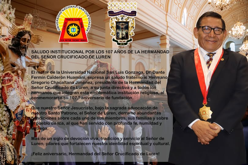 El rector de la Universidad Nacional San Luis Gonzaga, Dr. Dante Fermín Calderón Huamaní, expresa un saludo fraterno al Hermano Gregorio Chacaltana Jiménez, presidente de la Hermandad del Señor Crucificado de Luren, a su junta directiva y a todos los hermanos que integran esta emblemática institución religiosa, al conmemorarse su 107.º aniversario de fundación.