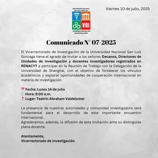 #ComunicadoVRI | El Vicerrectorado de Investigación de la Universidad Nacional San Luis Gonzaga tiene el agrado de invitar a los señores Decanos, Directores de Unidades de Investigación y docentes investigadores registrados en RENACYT a participar en la Reunión de Trabajo con la Delegación de la Universidad de Shanghai, con el objetivo de fortalecer los vínculos académicos y explorar oportunidades de cooperación internacional en materia de investigación.