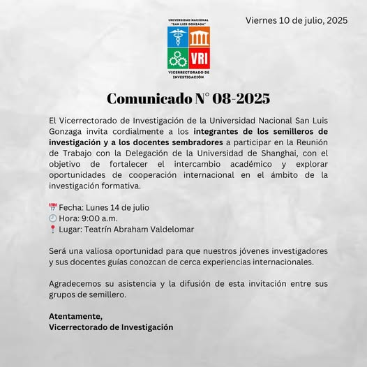 #ComunicadoVRI | El Vicerrectorado de Investigación de la Universidad Nacional San Luis Gonzaga invita cordialmente a los integrantes de los semilleros de investigación y a los docentes sembradores a participar en la Reunión de Trabajo con la Delegación de la Universidad de Shanghai, con el objetivo de fortalecer el intercambio académico y explorar oportunidades de cooperación internacional en el ámbito de la investigación formativa.