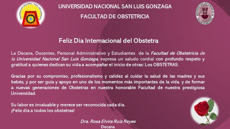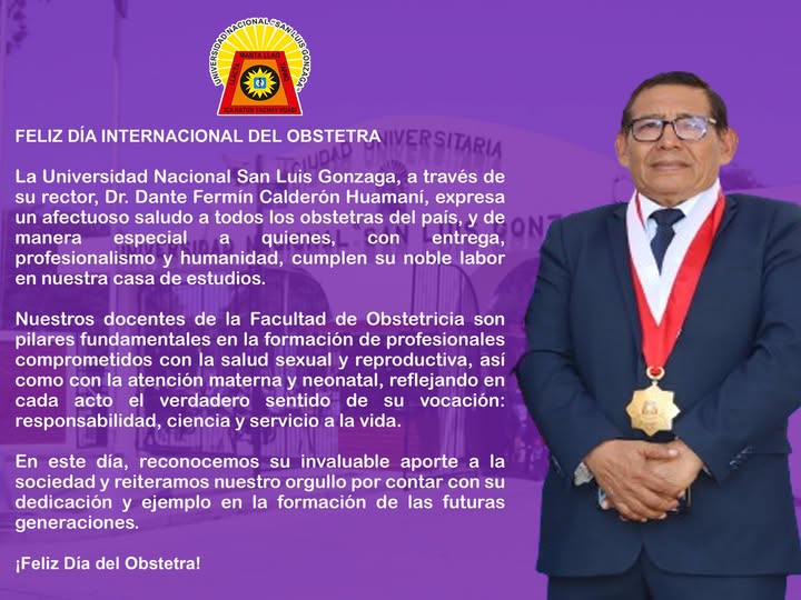 La Universidad Nacional San Luis Gonzaga, a través de su rector, Dr. Dante Fermín Calderón Huamaní, expresa un afectuoso saludo a todos los obstetras del país, y de manera especial a quienes, con entrega, profesionalismo y humanidad, cumplen su noble labor en nuestra casa de estudios.