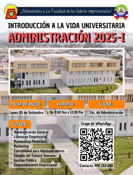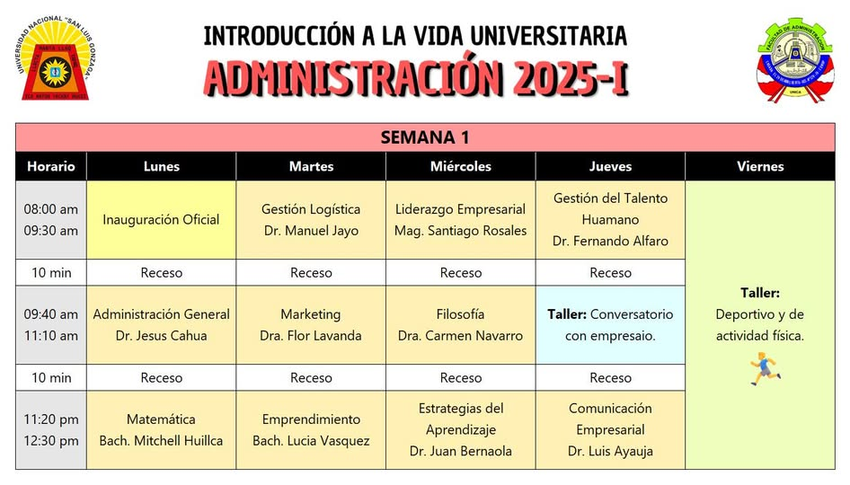 Esta es la programación de la Semana 1 del Ciclo Introductorio de Administración, donde nuestros nuevos ingresantes podrán conocer a sus docentes, descubrir más sobre su carrera y empezar a vivir la experiencia de ser parte de la Facultad de Administración.