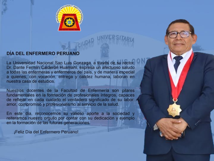 La Universidad Nacional San Luis Gonzaga, a través de su rector, Dr. Dante Fermín Calderón Huamaní, expresa un afectuoso saludo a todas las enfermeras y enfermeros del país, y de manera especial a quienes, con vocación, entrega y calidez humana, laboran en nuestra casa de estudios.