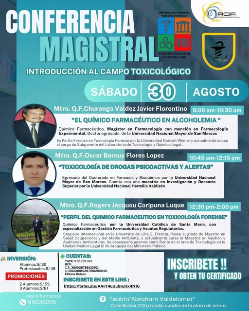 El Vicerrectorado de Investigación de la Universidad Nacional “San Luis Gonzaga” y el Seminario de Investigación (ACIF) tienen el honor de invitar a usted a participar en la Conferencia Magistral “Introducción al Campo Toxicológico”, que se llevará a cabo el día sábado 30 de agosto, en el Teatrín “Abraham Valdelomar” (Calle Bolívar 232, a media cuadra de la Plaza de Armas).
