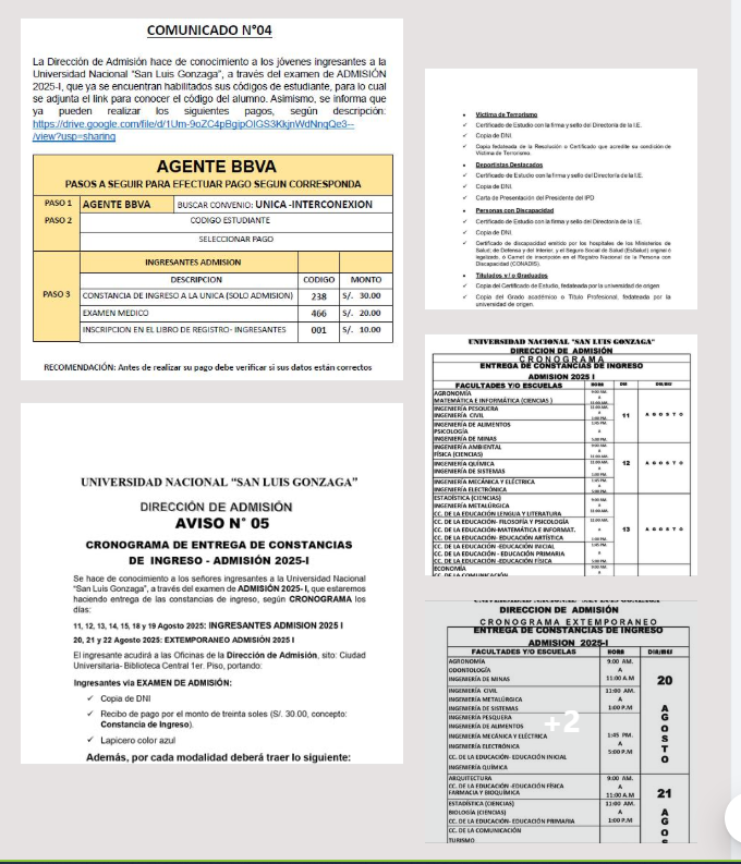 La Dirección de Admisión hace de conocimiento a los jóvenes ingresantes a la Universidad Nacional “San Luis Gonzaga”, a través del examen de ADMISIÓN 2025-I, que ya se encuentran habilitados sus códigos de estudiante, para lo cual se adjunta el link para conocer el código del alumno. Asimismo, se informa que ya pueden realizar los siguientes pagos, según descripción: https://drive.google.com/…/1Um…/view…