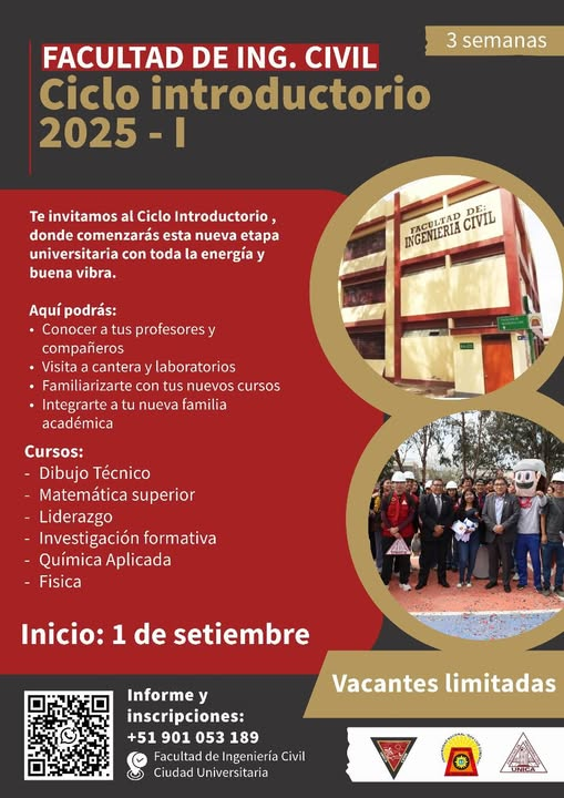 La Facultad de Ingeniería Civil invita a todos los ingresantes de las distintas modalidades CEPU y Admisión a participar en el Ciclo Introductorio 2025-I, donde comenzará esta nueva etapa universitaria.