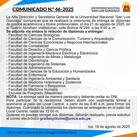 #EntregaDiplomas | La Alta Dirección y Secretaría General de la Universidad Nacional “San Luis Gonzaga” comunican que se realizará la ceremonia de entrega de diplomas de grados académicos y títulos profesionales, el día 21 de agosto de 2025, en el Teatrín Abraham Valdelomar, calle Bolívar N°294, a las 9:00 a. m.
