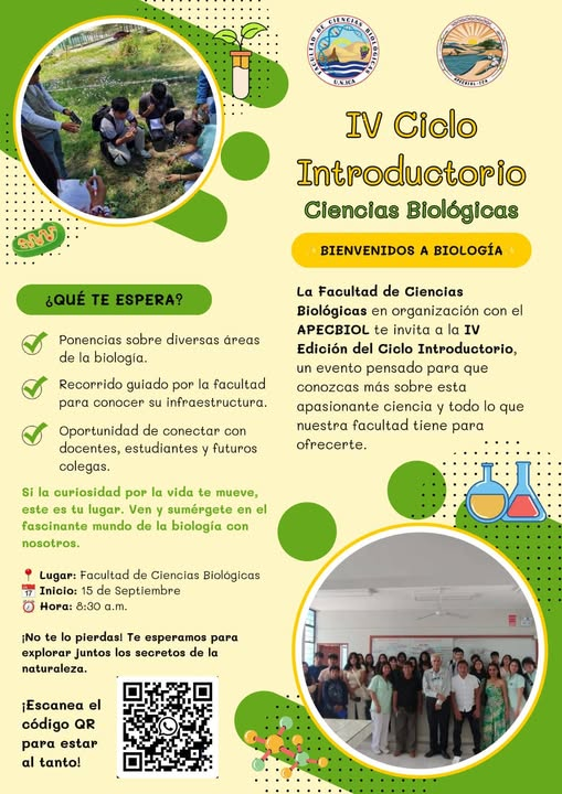 Organizado por la Facultad de Ciencias Biológicas de la mano de Apecbiol – Universidad Nacional San Luis Gonzaga, podrás disfrutar de ponencias sobre diversas áreas de la biología, un recorrido guiado por nuestra facultad y la oportunidad de conectar con docentes, estudiantes y futuros colegas.