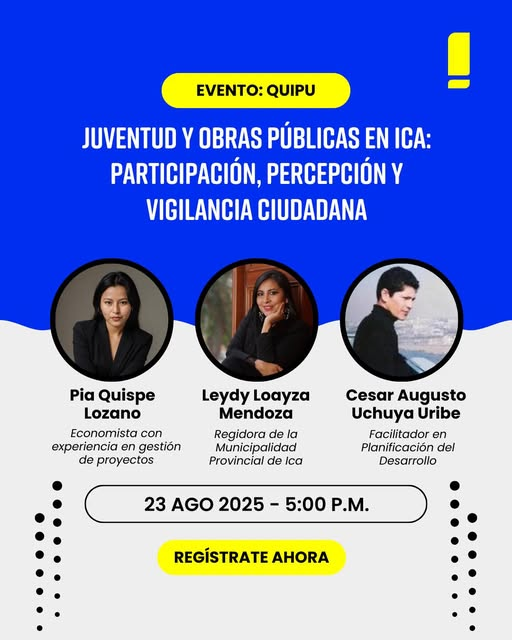Únete al Quipu – Juventud y Obras Públicas en Ica: participación, percepción y vigilancia ciudadana, un espacio donde reflexionaremos sobre cómo las y los jóvenes pueden ser agentes de cambio en el seguimiento de proyectos públicos.