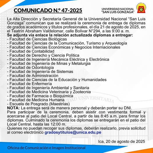 La Alta Dirección y Secretaría General de la Universidad Nacional “San Luis Gonzaga” comunican que se realizará la ceremonia de entrega de diplomas de grados académicos y títulos profesionales, el día 21 de agosto de 2025, en el Teatrín Abraham Valdelomar, calle Bolívar N°294, a las 9:00 a. m.
