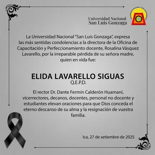 | La Universidad Nacional “San Luis Gonzaga”, expresa las más sentidas condolencias a la directora de la Oficina de Capacitación y Perfeccionamiento docente, Rosalina Vásquez Lavarello, por la irreparable pérdida de su señora madre, quien en vida fue: Elida Lavarello Siguas.