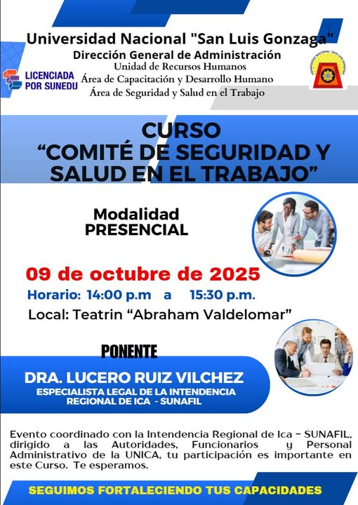 #Curso | El jueves 9 de octubre a partir de las 2 de la tarde en el teatrín Abraham Valdelomar, se realizará de manera presencial el curso: «Comité de seguridad y salud en el trabajo». El evento es una coordinación con la intendencia Regional de Ica – SUNAFIL, dirigido a las autoridades, funcionarios y personal administrativo de la UNICA.