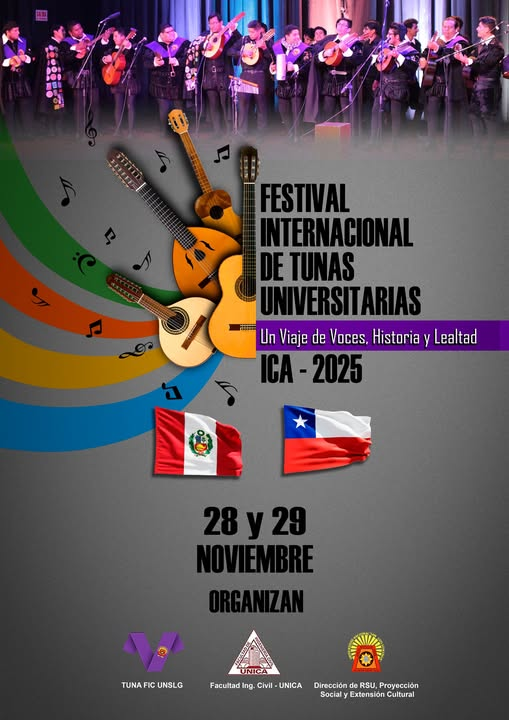 Por primera vez la Dirección de RSU, Proyección Social y Extensión Cultural de la Universidad Nacional «San Luis Gonzaga» en coordinacion con la Tuna De La Fic Unslg Ica y la Facultad de Ingeniería Civil organiza el I Festival Internacional de Tunas Universitarias 2025 «Un viaje de voces, historia y lealtad»![]()