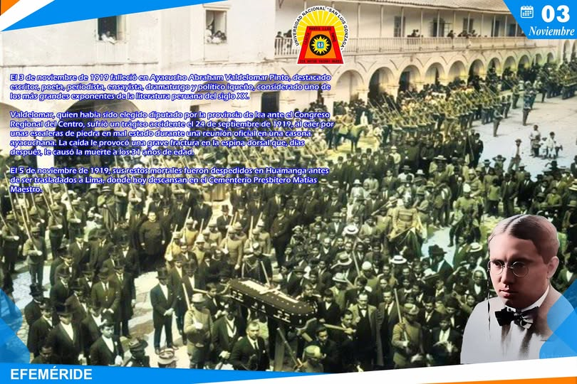 El 3 de noviembre de 1919 falleció en Ayacucho Abraham Valdelomar Pinto, destacado escritor, poeta, periodista, ensayista, dramaturgo y político iqueño, considerado uno de los más grandes exponentes de la literatura peruana del siglo XX.