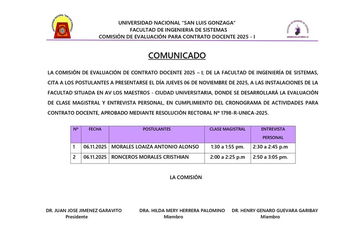 #FIS | La Comisión de Evaluación de Contrato Docente 2025 – I; de la Facultad de Ingeniería de Sistemas, cita a los postulantes a presentarse el día jueves 06 de noviembre de 2025, a las instalaciones de la facultad situada en Av. Los Maestros – Ciudad Universitaria, donde se desarrollará la evaluación de clase magistral y entrevista personal, en cumplimiento del cronograma de actividades para contrato docente, aprobado mediante Resolución Rectoral Nº 1798-R-UNICA-2025.