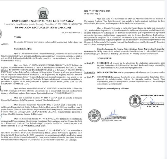#EleccionesEstudiantiles | Ante los cierre de los locales por la huelga indefinida de docentes universitarios y salvaguardando la integridad de la comunidad universitaria y por consiguiente, el de los estudiantes, el Consejo Universitario acuerda SUSPENDER el proceso de las elecciones de estudiantes representantes ante los Órganos de Gobierno de la Universidad Nacional San Luis Gonzaga, establecido para el 7 de noviembre del 2025, hasta nueva programación.