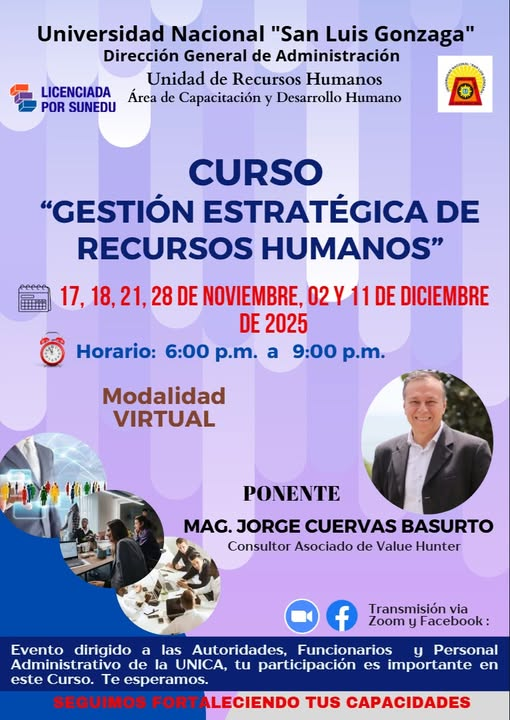 #Capacitación | CURSO “GESTIÓN ESTRATÉGICA DE RECURSOS HUMANOS”, el cual está dirigido a Autoridades, Funcionarios y Personal Administrativo de las diversas Facultades, Direcciones y Dependencias de la Universidad Nacional “San Luis Gonzaga”. Este evento se llevará a cabo los días 17, 18, 21, 28 de noviembre, 02 y 11 de diciembre de 2025, en el horario de: 06:00 p.m. a 09:00 p.m. (06 sesiones), la ponencia estará a cargo del MAG. JORGE CUERVAS BASURTO – Consultor Asociado de VALUE HUNTER, en la MODALIDAD: VIRTUAL.