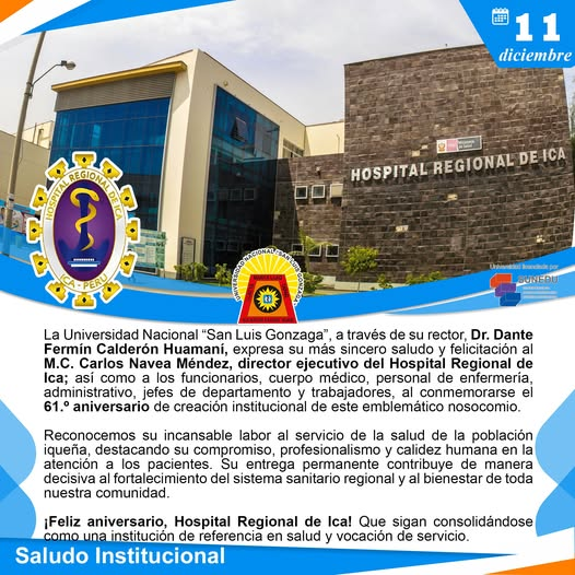 #SaludosInstitucionales2025 | La Universidad Nacional San Luis Gonzaga, a través de su rector, Dr. Dante Fermín Calderón Huamaní, expresa su más sincero saludo y felicitación al M.C. Carlos Navea Méndez, director ejecutivo del Hospital Regional de Ica; así como a sus funcionarios, cuerpo médico, personal de enfermería, administrativos, jefes de departamento y trabajadores, al conmemorarse el 61.º aniversario de creación institucional de este emblemático nosocomio.