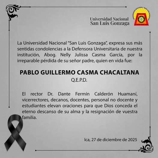 | La Universidad Nacional “San Luis Gonzaga”, expresa sus más sentidas condolencias a la Defensora Universitaria, Abog. Nelly Julissa Casma García, por la irreparable pérdida de su señor padre, quien en vida fue: Pablo Guillermo Casma Chacaltana.