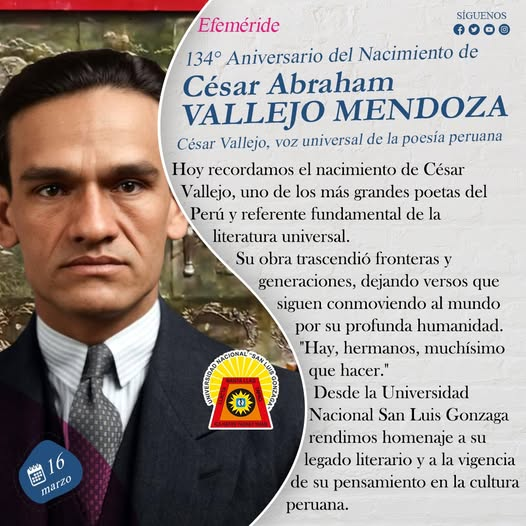 Hoy recordamos el nacimiento de César Vallejo, uno de los más grandes poetas del Perú y referente fundamental de la literatura universal.