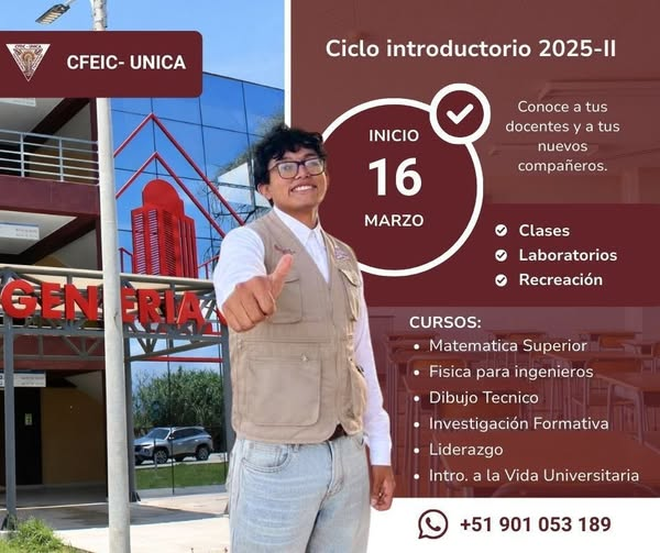 Facultad de Ingeniería Civil auspicia al Centro Federado de Estudiantes de Ingeniería Civil (CFEIC) de la Universidad Nacional San Luis Gonzaga, quien invita a todos los ingresantes y estudiantes interesados a participar en el Ciclo Introductorio 2025-II.