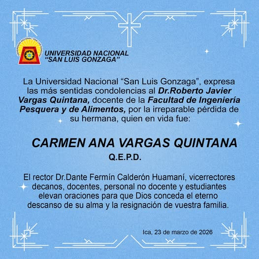 | La Universidad Nacional “San Luis Gonzaga”, expresa las más sentidas condolencias al Mag. Roberto Javier Vargas Quintana, docente de la Facultad de Ingeniería Pesquera y de Alimentos, por a irreparable perdida de su hermana, quien en vida fue: