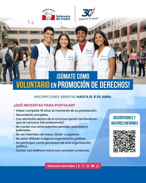 ¿Eres estudiante de la UNSLG y quieres generar un impacto positivo en nuestra sociedad? La Defensoría del Pueblo te invita a formar parte de su equipo de voluntarios para este 2026.