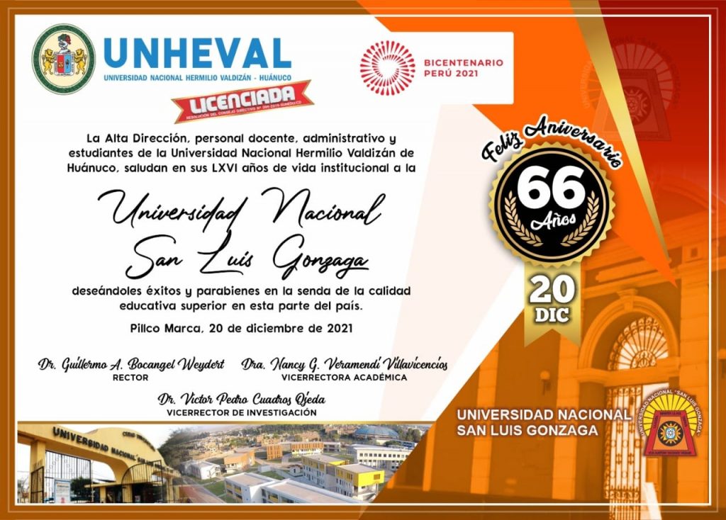 #RumboAlLicenciamiento | El rector de la UNICA Dr. Anselmo Magallanes Carrillo, vicerrectores, docentes, estudiantes y trabajadores expresan su agradecimiento a la Universidad Nacional Hermilio Valdizán por su saludo institucional al conmemorarse el 20 de diciembre nuestro LXVI Aniversario.![]()