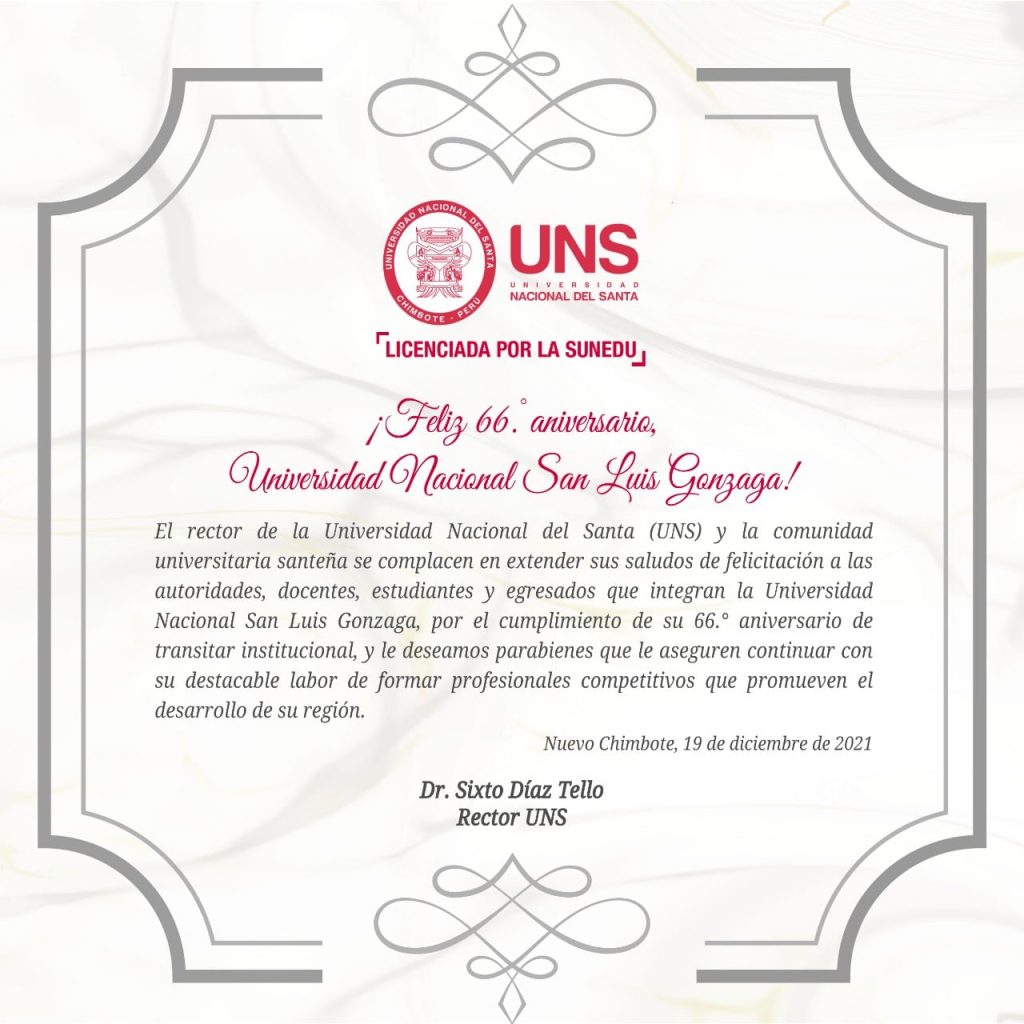 #RumboAlLicenciamiento | El rector de la UNICA Dr. Anselmo Magallanes Carrillo, vicerrectores, docentes, estudiantes y trabajadores expresan su agradecimiento a la Universidad Nacional del Santa por su saludo institucional al conmemorarse nuestro LXVI Aniversario.![]()