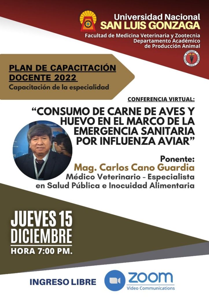 #Capacitación | El departamento académico de Producción Animal de la facultad de Medicina Veterinaria y Zootecnia de la Universidad Nacional «San Luis Gonzaga», invita a la comunidad universitaria a participar de la conferencia virtual «CONSUMO DE CARNE DE AVES Y HUEVO EN EL MARCO DE LA EMERGENCIA SANITARIA POR INFLUENZA AVIAR» a cargo del ponente: Mag. CARLOS CANO GUARDIA, el día jueves 15 de diciembre a horas 7.00 p.m