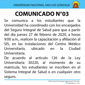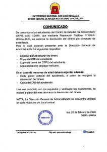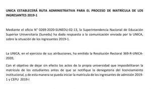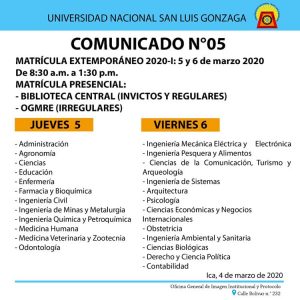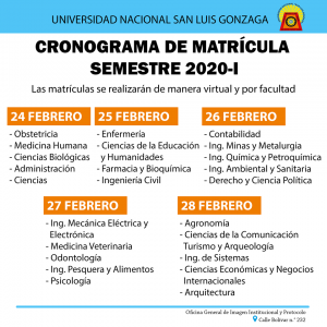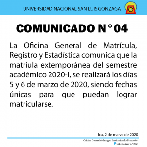 La Oficina General de Matrícula, Registro y Estadística (OGMRE) comunica a los estudiantes que no se matricularon en el Semestre Académico 2020 – I en las fechas establecidas para dicho proceso, que se ha habilitado la matrícula extemporánea por única vez, en fechas únicas e improrrogables, según el siguiente cronograma: