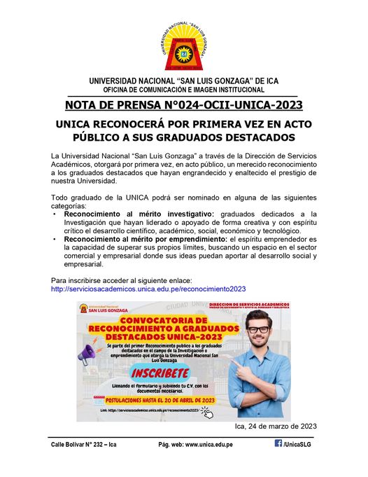 La Universidad Nacional “San Luis Gonzaga” a través de la Dirección de Servicios Académicos, otorgará por primera vez, en acto público, un merecido reconocimiento a los graduados destacados que hayan engrandecido y enaltecido el prestigio de nuestra Universidad.